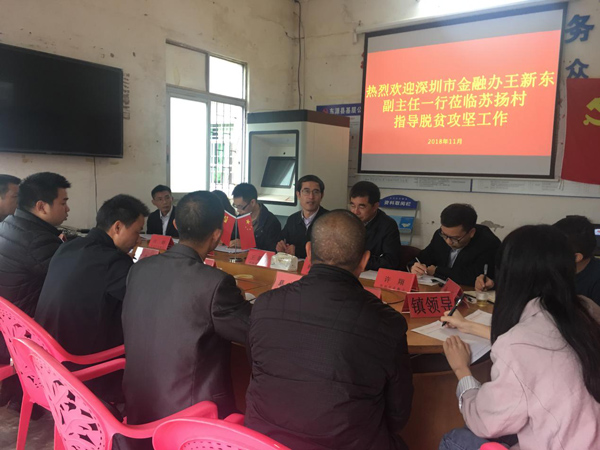 11月1日,市金融办党组成员、副主任王新东同志率领合作处、监管一处、综合处代表同志以及中国人寿深圳分公司、中国人保深圳分公司业务代表,赴市金融办对口帮扶点河源市东源县上莞镇苏杨村开展对口扶贫实地调研工作。考察中,王新东同志首先听取了驻村工作队关于精准扶贫项目工作进展情况的汇报以及下一步推进光伏发电项目和茶油加工项目的相关准备情况,与工作队和镇、村党委有关负责同志仔细研究了关于苏杨村试点开展对口帮扶医疗补充保险项目的可行性,向苏杨村2018年大学新生家长现场发放了入学资助金,并现场考察了铁皮石斛、茶叶加工厂等精准扶贫项目工程进展。