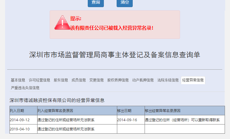 近日,我局发现深圳市德诚融资担保有限公司(融资性担保公司经营许可证编号粤8800540)被深圳市市场监督管理局载入经营异常名录。鉴于该公司存在经营异常情况,请各相关单位及个人在未收到我局进一步通知公告事项前,审慎与该公司开展融资担保业务,特此提示并予公告。